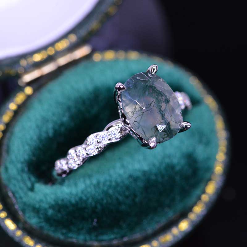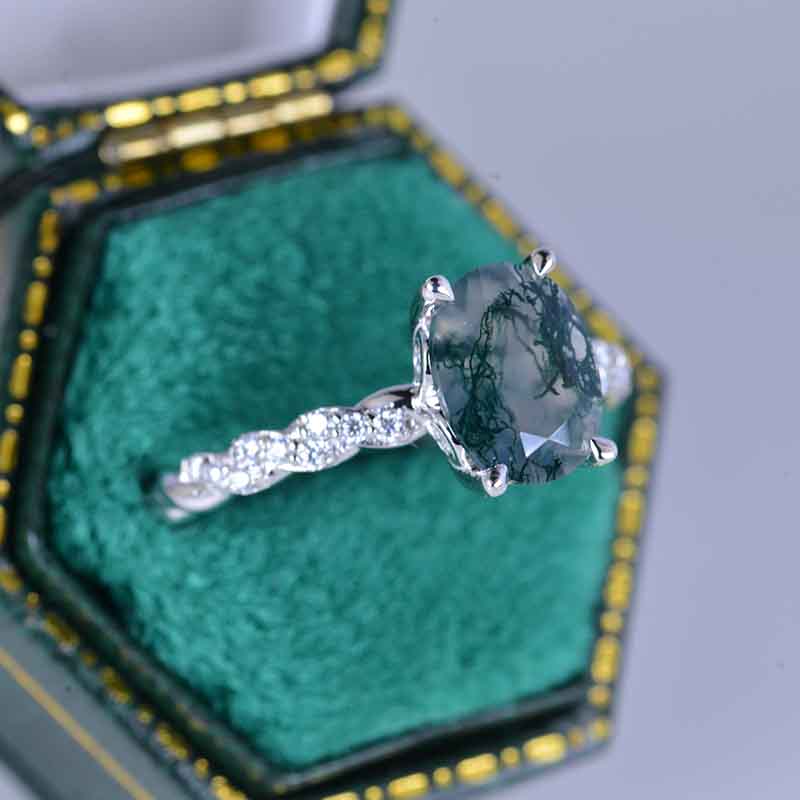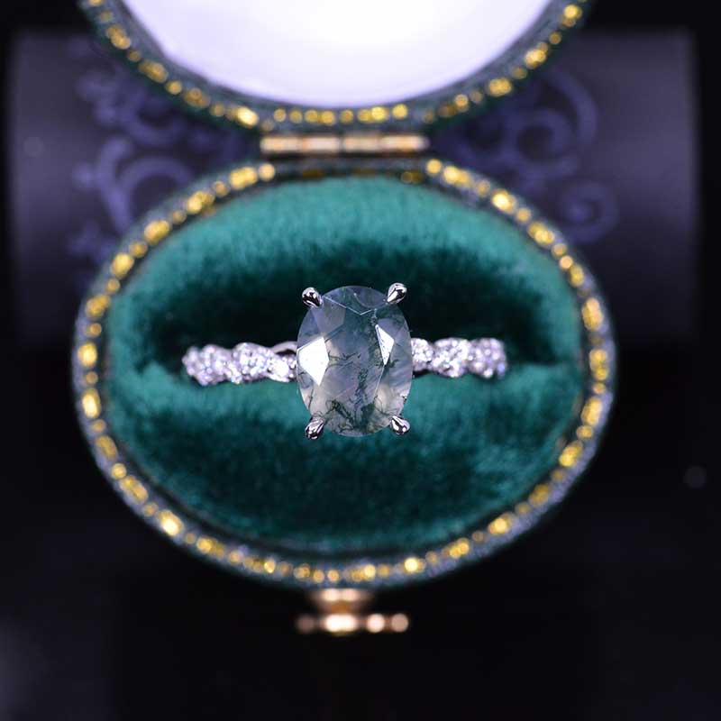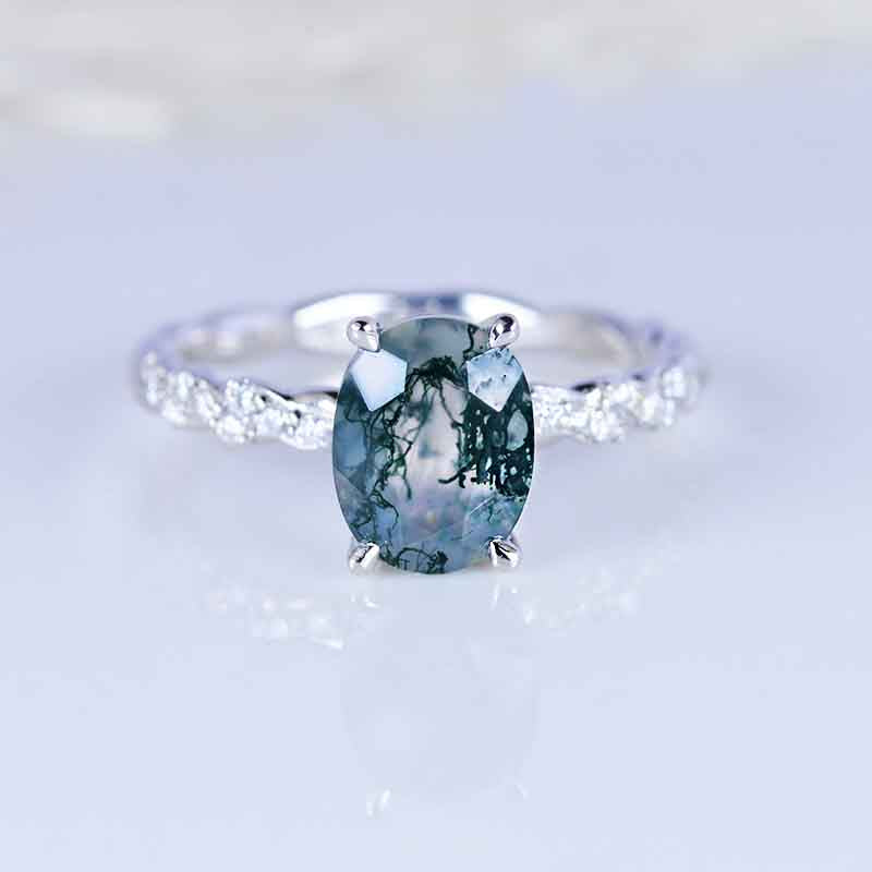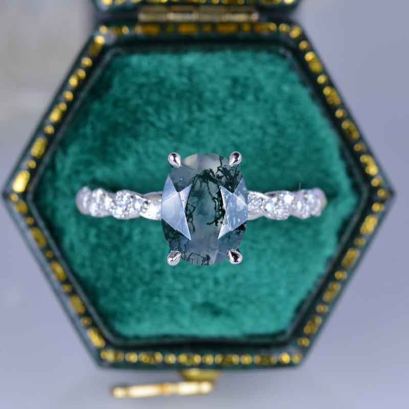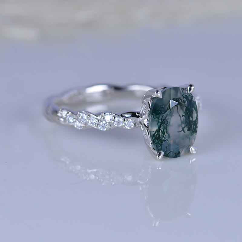 Engagement Ring : 2 Carat Moss Agate Oval 9x7 mm  VG-Cut, Ex-Polish, VG-Symmetry Center Stone with 18 Colorless 0.4 CTW Moissanite