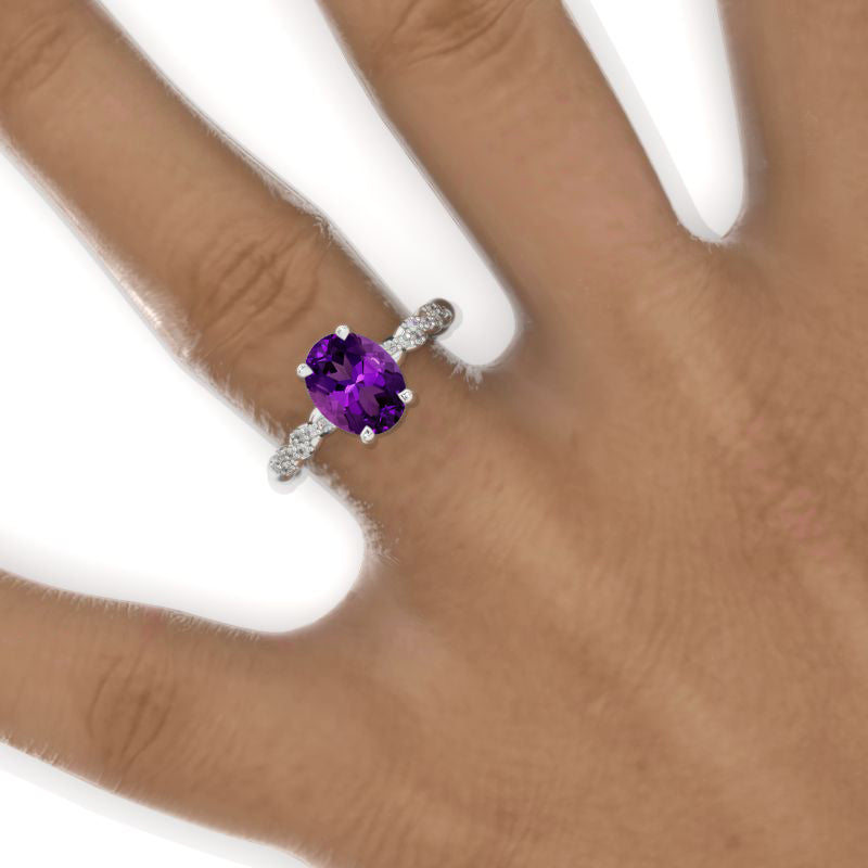 Engagement Ring: 2 Carat Genuine Natural Amethyst- AAAA Grade Oval 9x7mm VG-Cut, Ex-Polish, VG-Symmetry Center Stone with 18 Colorless 0.4 CTW Moissanite