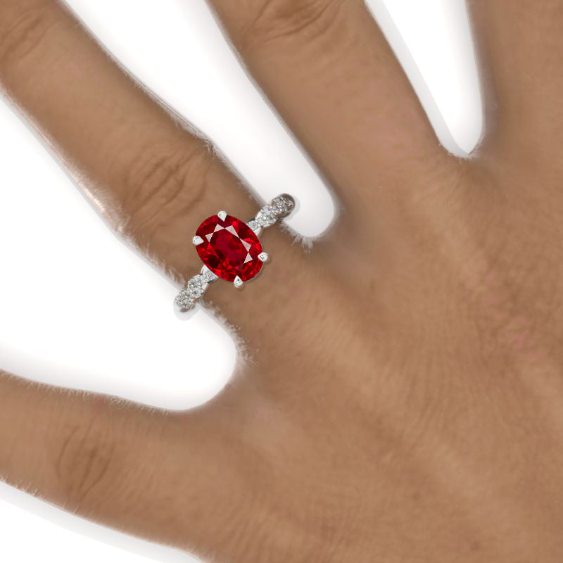 Engagement Ring: 2 Carat Giliarto Ethically Lab-Grown Ruby AAA+ Grade Oval 9x7mm VG-Cut, Ex-Polish, VG-Symmetry Center Stone with 18 Colorless 0.4 CTW Moissanite