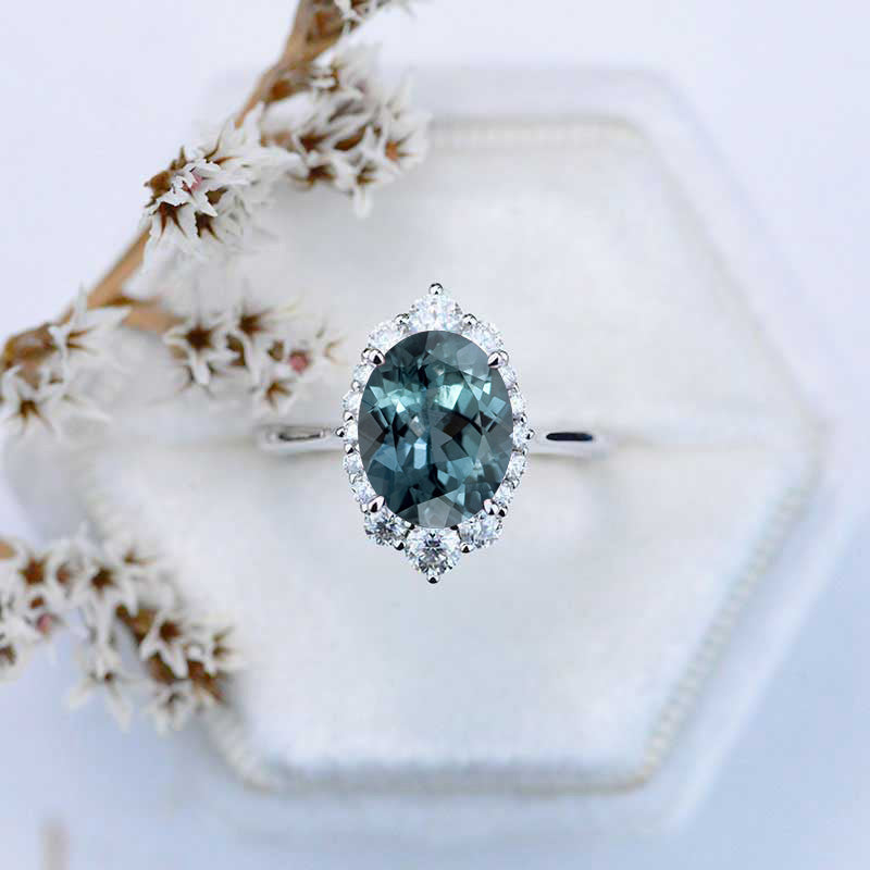 2 Carat Ethically Lab-Grown Teal Sapphire Oval 9x7 mm VG-Cut, Ex-Polish, VG-Symmetry Center Stone with 18 Colorless 0.8 CTW Moissanite  (D-Colorless, VVS1 clarity) Accent Stones 14K White  Gold  Ring.