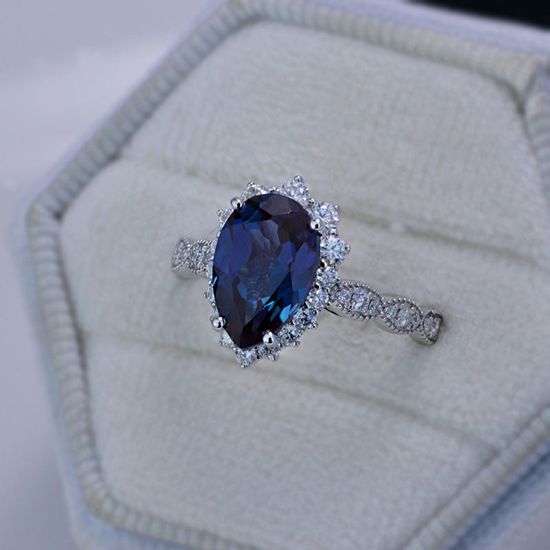 2 Carat Ethically LAB-Grown Alexandrite 10x7mm, VVS1-Clarity, VG-Cut, Ex-Polish, VG-Symmetry Center Stone with 30 Colorless 0.8 CTW Moissanite  (D-Colorless, VVS1 clarity) Accent Stones 14K White  Gold  Ring.