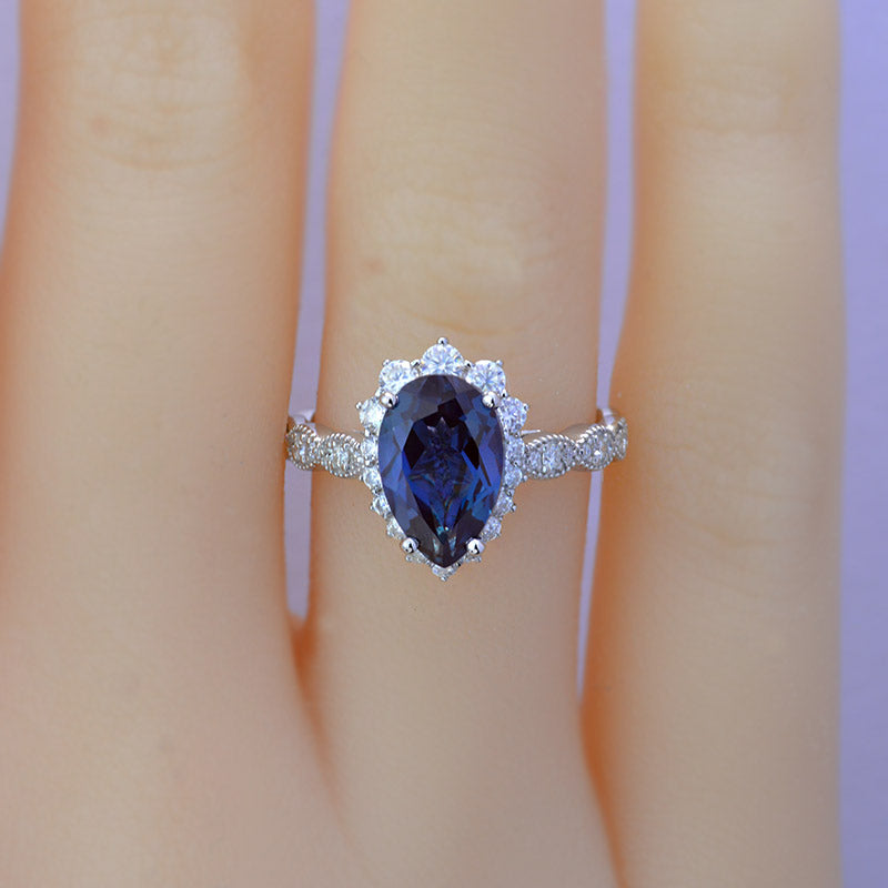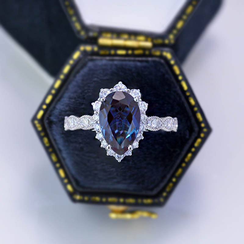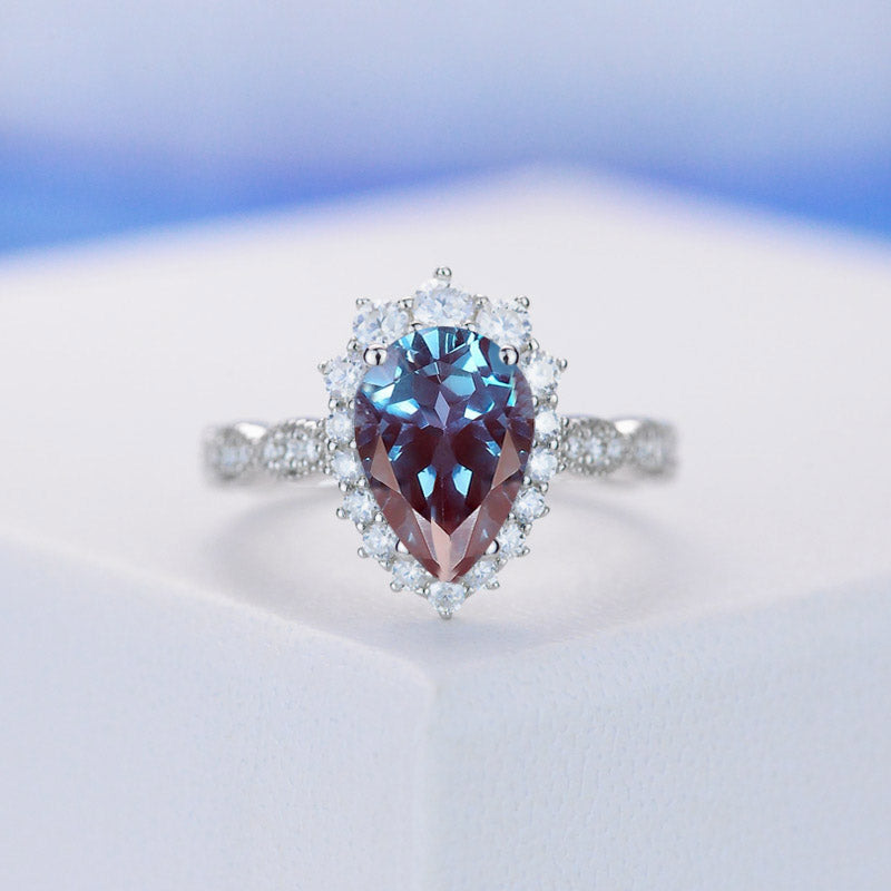 14K White Gold 2 Carat Pear Alexandrite Halo Engagement Ring - Giliarto