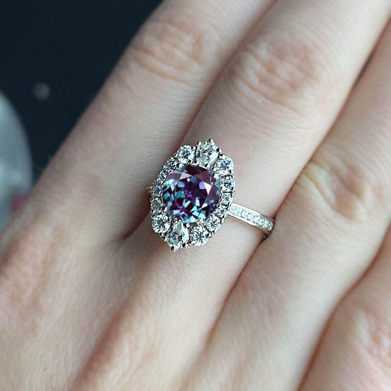 2 Carat Ethically LAB-Grown Alexandrite Round 8 mm VVS1-Clarity, VG-Cut, Ex-Polish, VG-Symmetry Center Stone with 30 Colorless 0.8 CTW Moissanite (D-Colorless, VVS1 clarity) Accent Stones 14K White  Gold  Ring.