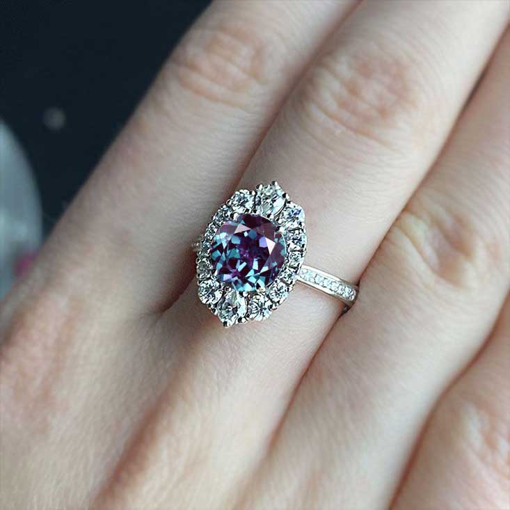 2 Carat Ethically Lab-Grown Alexandrite Round  8mm, VG-Cut, Ex-Polish, VG-Symmetry Center Stone with 30 Colorless 0.8 CTW Moissanite  (D-Colorless, VVS1 clarity) Accent Stones 14K White  Gold  Ring.