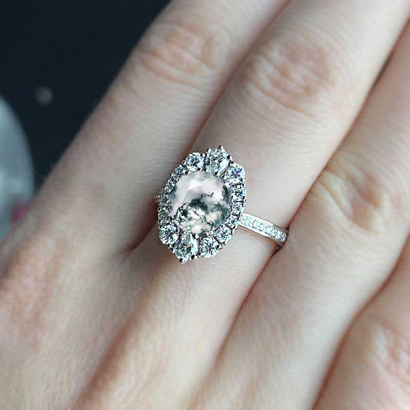 14K White Gold 2 Carat Round Gray Genuine Moss Agate Halo Engagement Ring