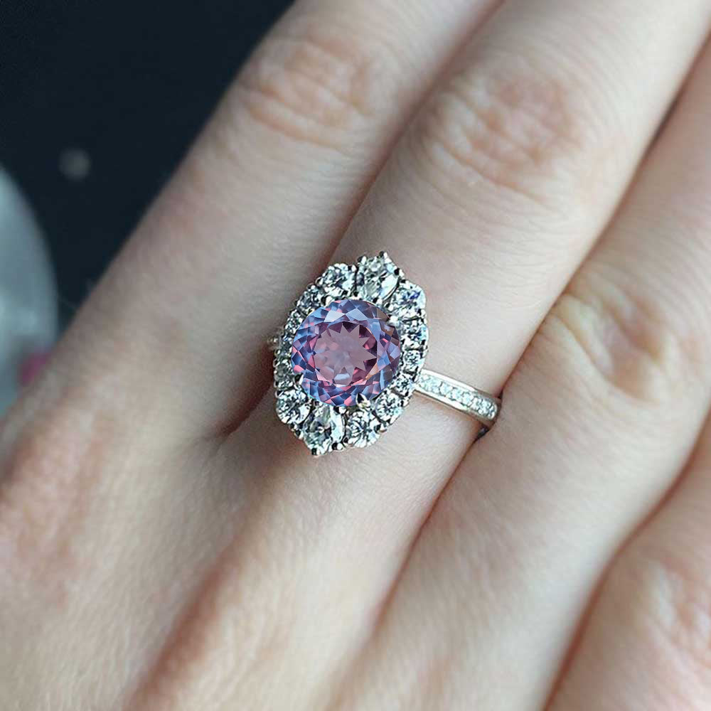 14K White Gold 2 Carat Round Portuguese Cut Alexandrite Halo Engagemen - Giliarto