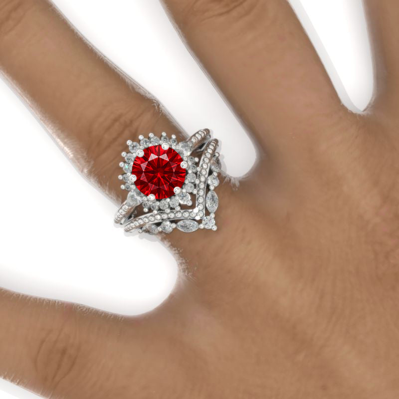 14K White Gold 2 Carat Round Ruby Six Pronds Halo Engagement Ring V- Band Eternity Ring Set