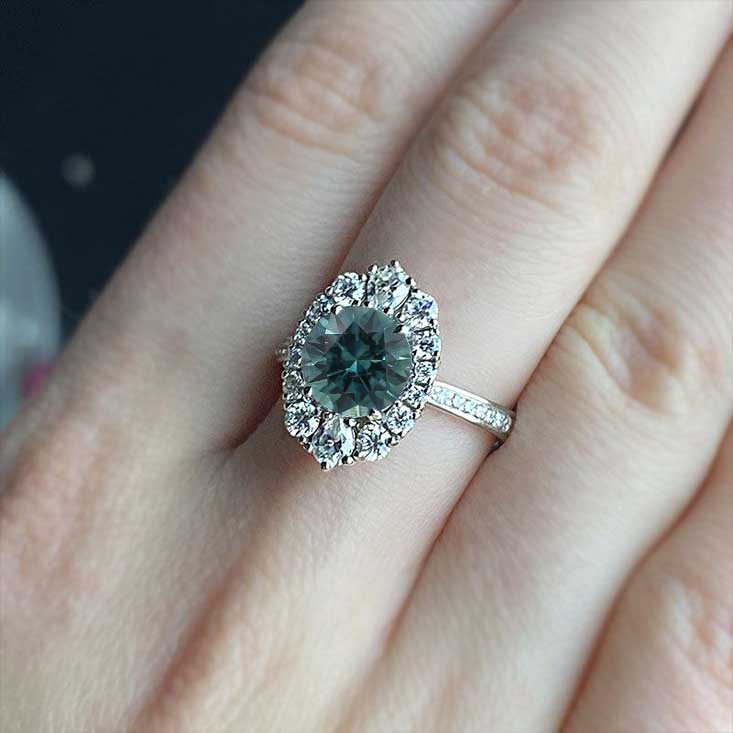 2 Carat Ethically Lab-Grown Teal Sapphire Round  8mm  VVS1-Clarity, VG-Cut, Ex-Polish, VG-Symmetry Center Stone with 30 Colorless 0.8 CTW Moissanite  (D-Colorless, VVS1 clarity) Accent Stones 14K White  Gold  Ring.