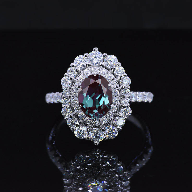 14K White Gold 3.2 CTW Oval Alexandrite Double Halo Engagement Ring - Giliarto