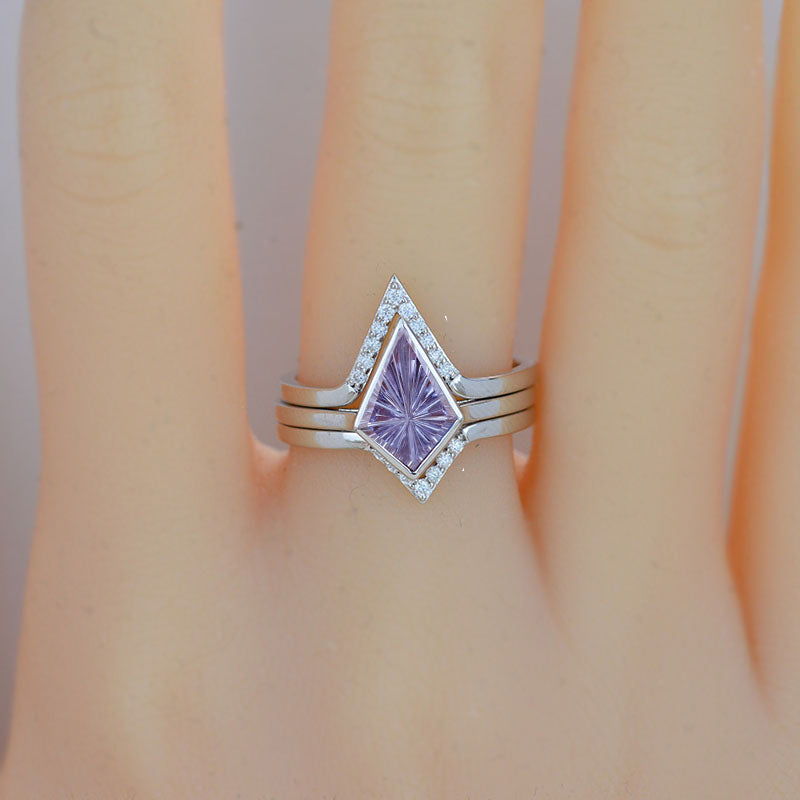 14K White Gold 3 Carat Fireworks Cut Kite Alexandrite Bezel Engagement Ring, Three Rings Set