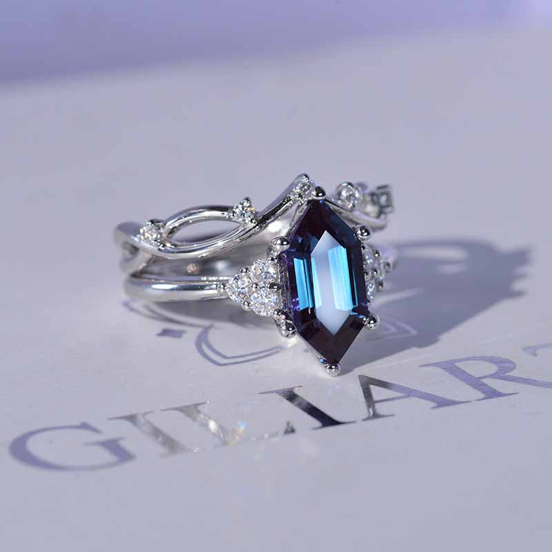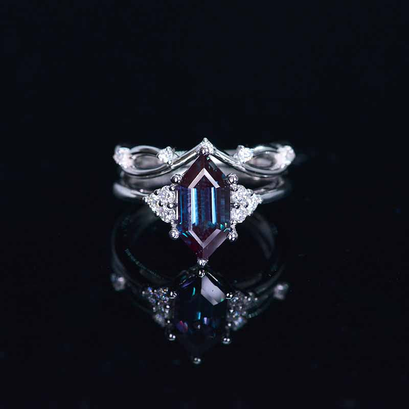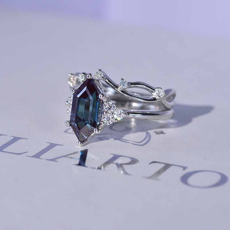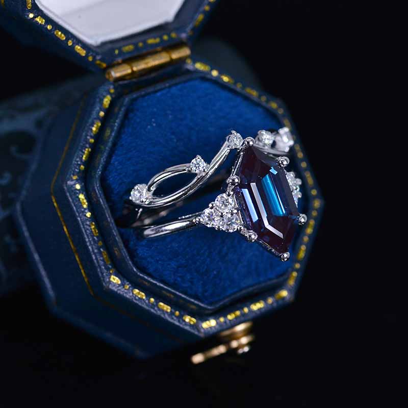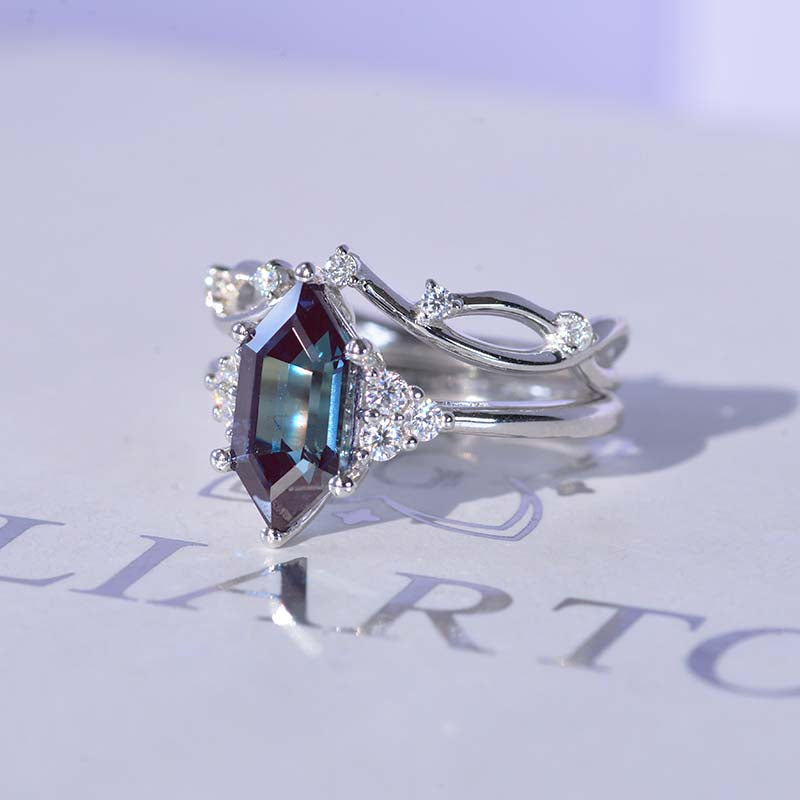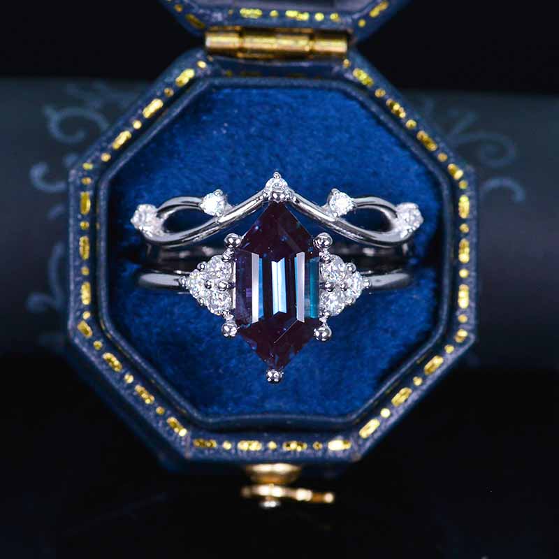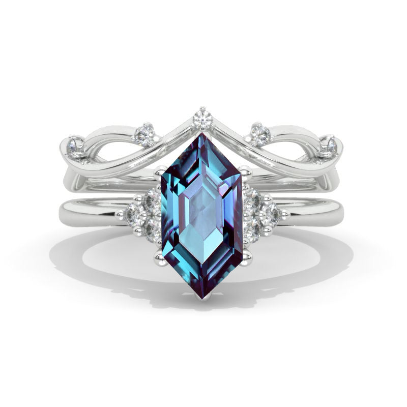 14K White Gold 3 Carat Hexagon Alexandrite Halo Engagement Ring, Eternity Ring Set