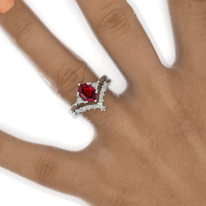 14K White Gold 3 Carat Hexagon Ruby Halo Engagement Ring, Eternity Ring Set