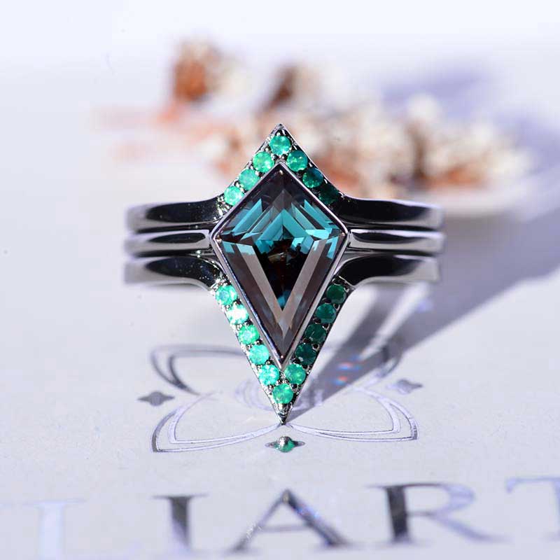 14K White Gold 3 Carat Kite Alexandrite Bezel Engagement Ring, Emerald Three Rings Set
