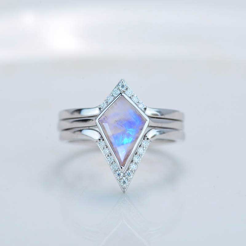 14K White Gold 3 Carat Kite Genuine Moonstone Bezel Engagement Ring, Three Rings Set