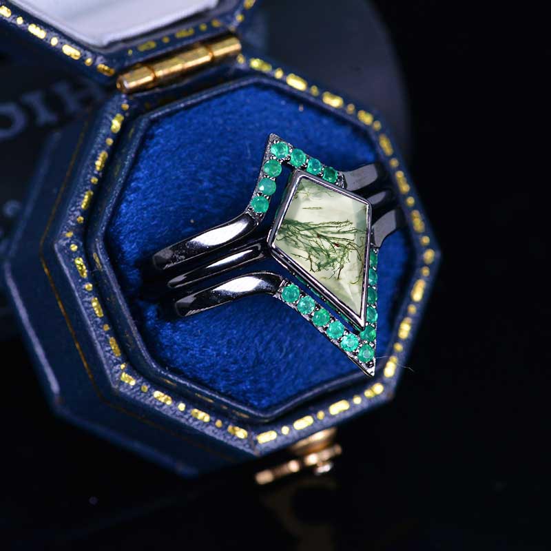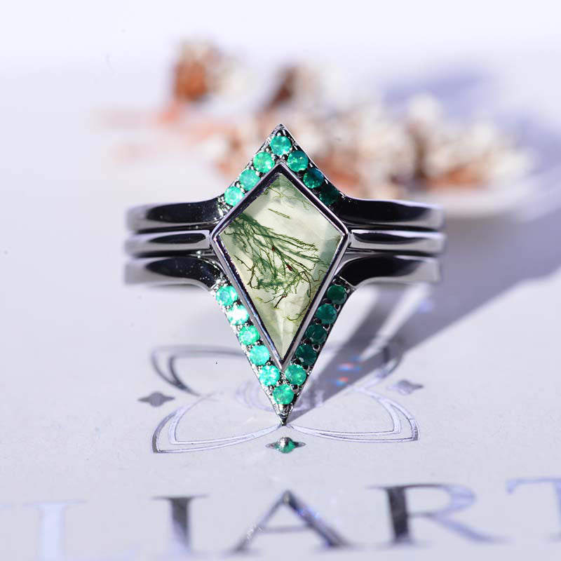 14K White Gold 3 Carat Kite Genuine Moss Agate Bezel Engagement Ring, Emerald Three Rings Set Model 721-12x8