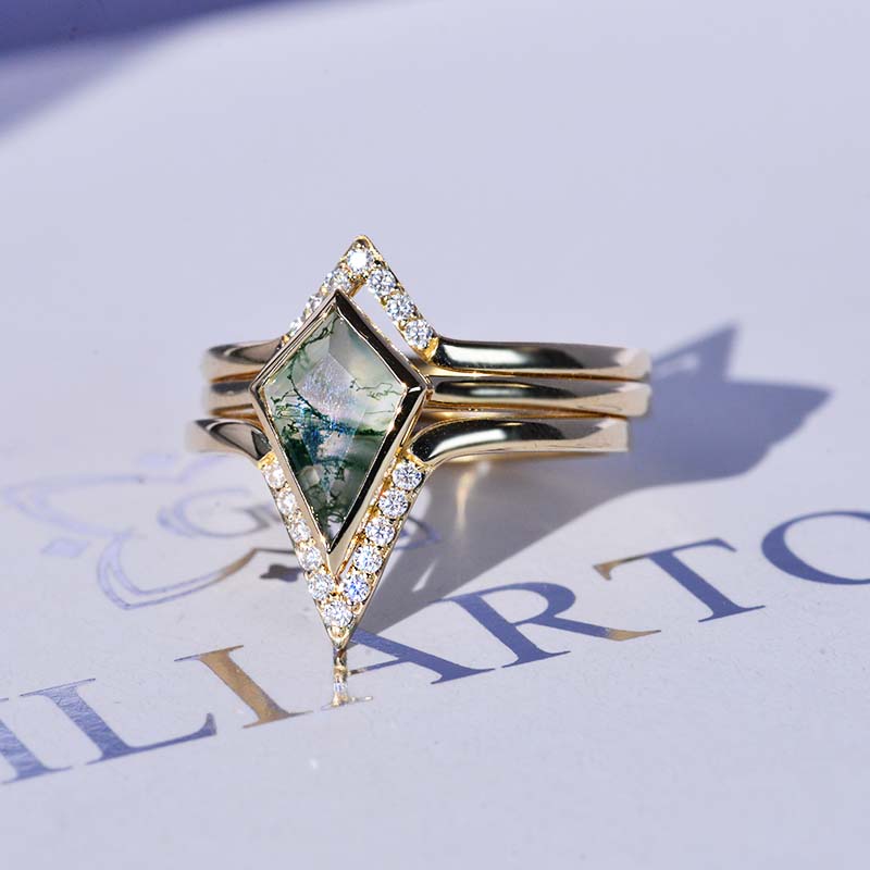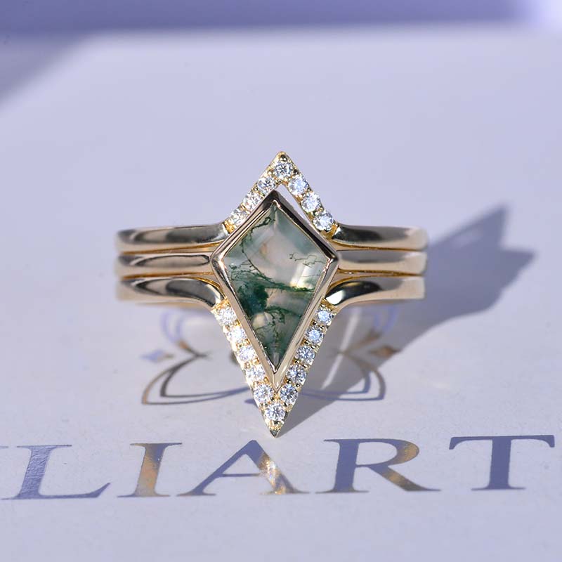 14K White Gold 3 Carat Kite Moss Agate Halo Engagement Ring, Three Rings Set Model 721-12x8