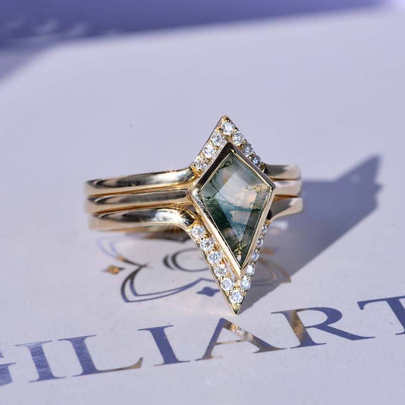 14K White Gold 3 Carat Kite Moss Agate Halo Engagement Ring, Three Rin - Giliarto