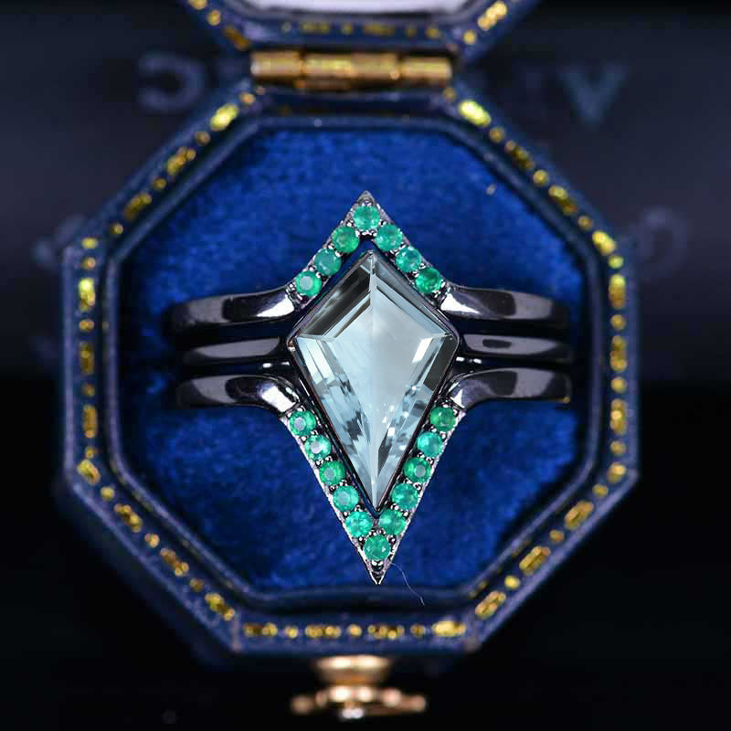14K White Gold 3 Carat Kite Natural Aquamarine Bezel Engagement Ring, Emerald Three Rings Set