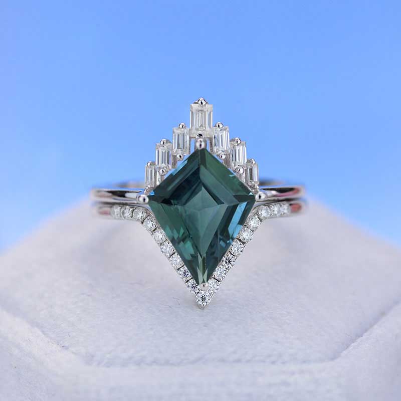 Engagement : 3 Carat Ethically Lab-Grown Teal Sapphire Kite 12x8 mm VG-Cut, Ex-Polish, VG-Symmetry Center Stone with 38 Colorless 0.5 CTW Moissanite