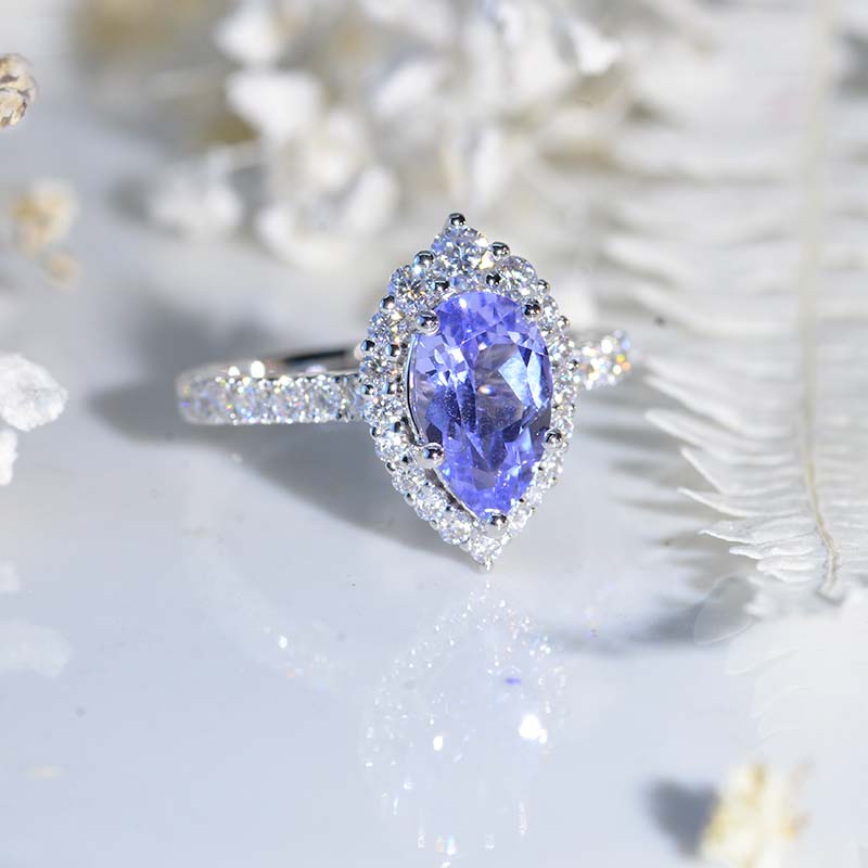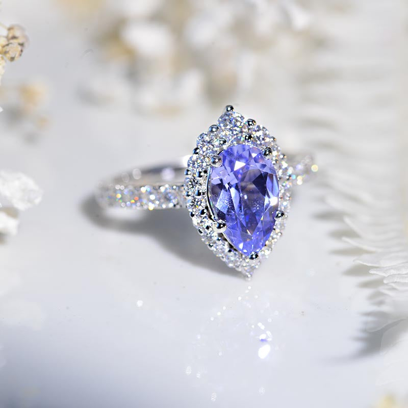14K White Gold 3 Carat Lavender Sapphire Pear Cut Halo Moissanite Ring