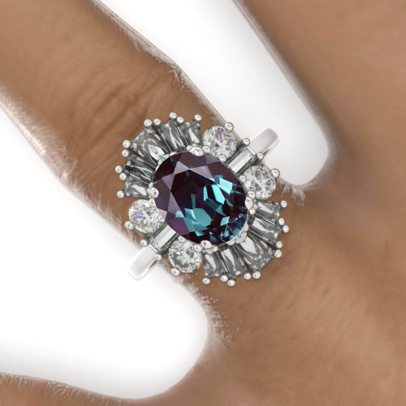 14K White Gold 3 Carat Oval Alexandrite Halo Engagement Ring - Giliarto