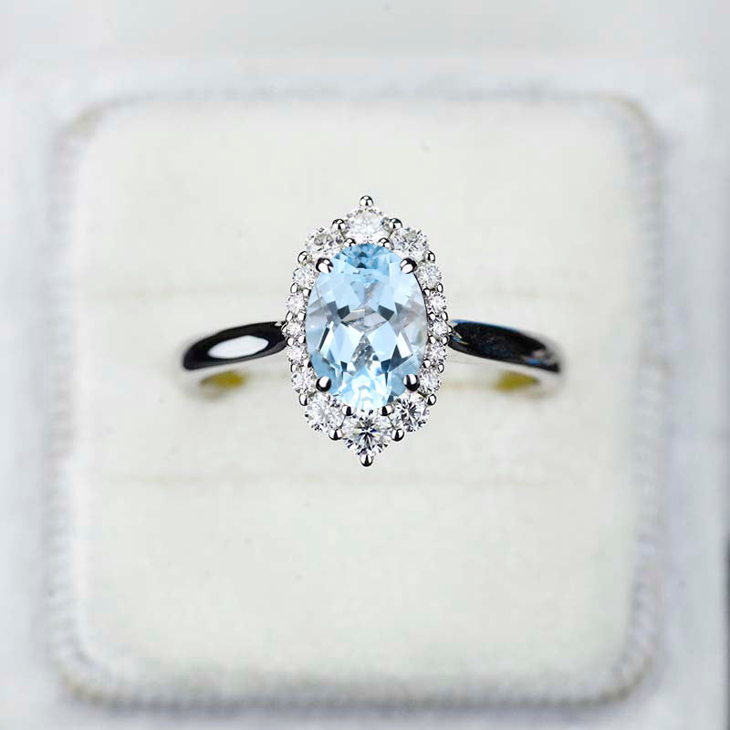 14K White Gold 3 Carat Oval Aquamarine Halo Engagement Ring - Giliarto