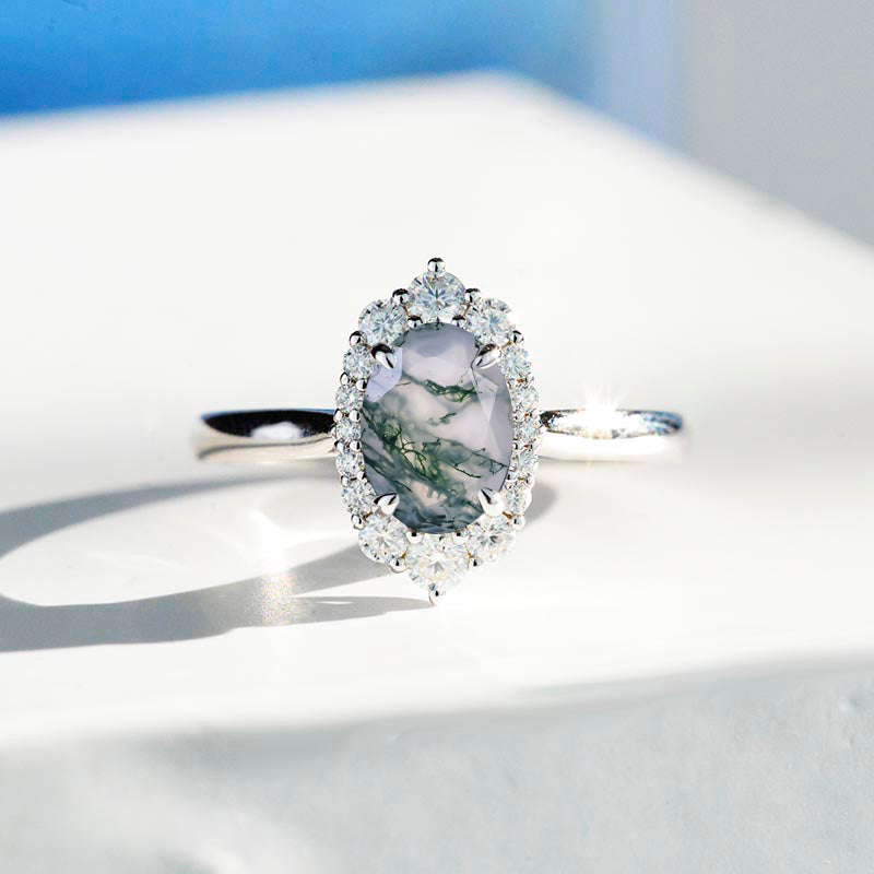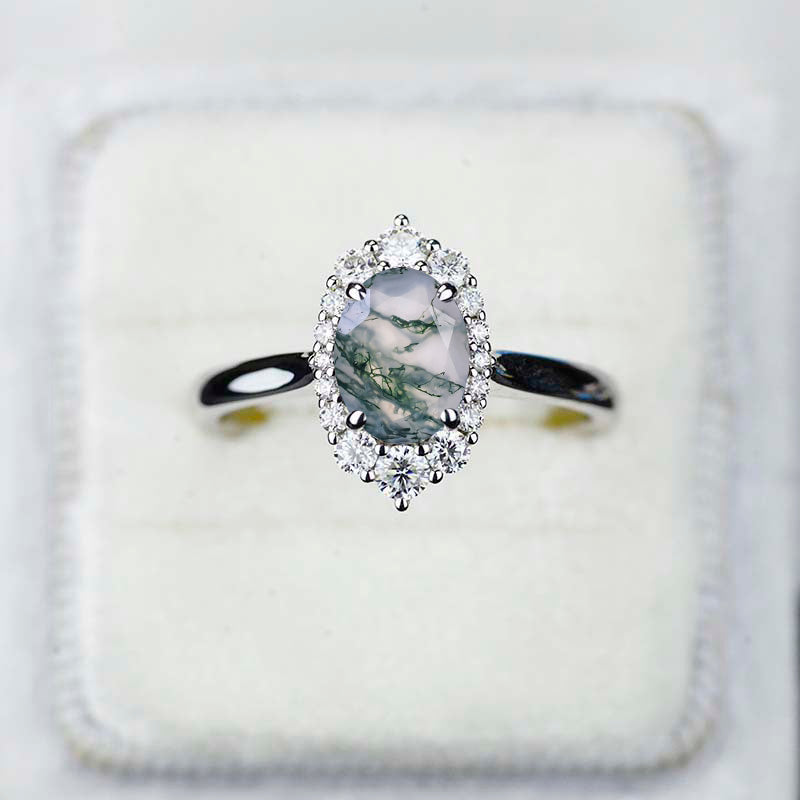 14K White Gold 3 Carat Oval Genuine Moss Agate Halo Engagement Ring Mo - Giliarto