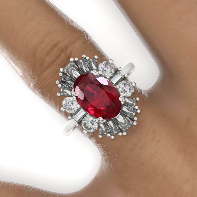 3 Carat Ethically Lab-Grown Ruby Oval 10x7 mm,  VVS1-Clarity, VG-Cut, Ex-Polish, VG-Symmetry Center Stone with 16 Colorless 0.8 CTW Moissanite  (G-H color,  I1 clarity) Accent Stones 14K White  Gold  Ring.