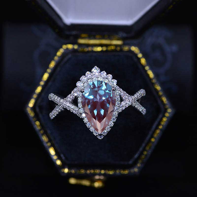 Engagement Ring : 3 Carat Ethically Lab-Grown Alexandrite Pear 11x7mm, VG-Cut, Ex-Polish, VG-Symmetry Center Stone with 124 Colorless