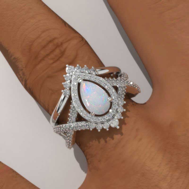 14K White Gold 3 Carat Pear Genuine White Opal Halo Twisted Engagement Ring Eternity Ring