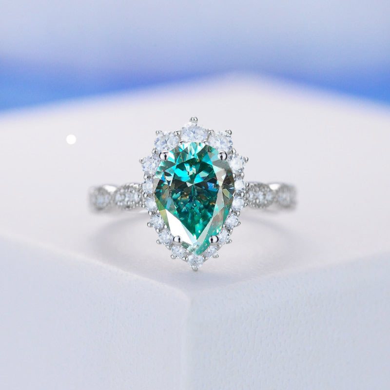 14K White Gold 3 Carat Pear Green Moissanite Halo Engagement Ring