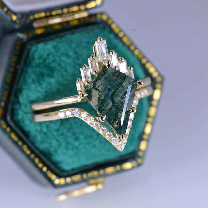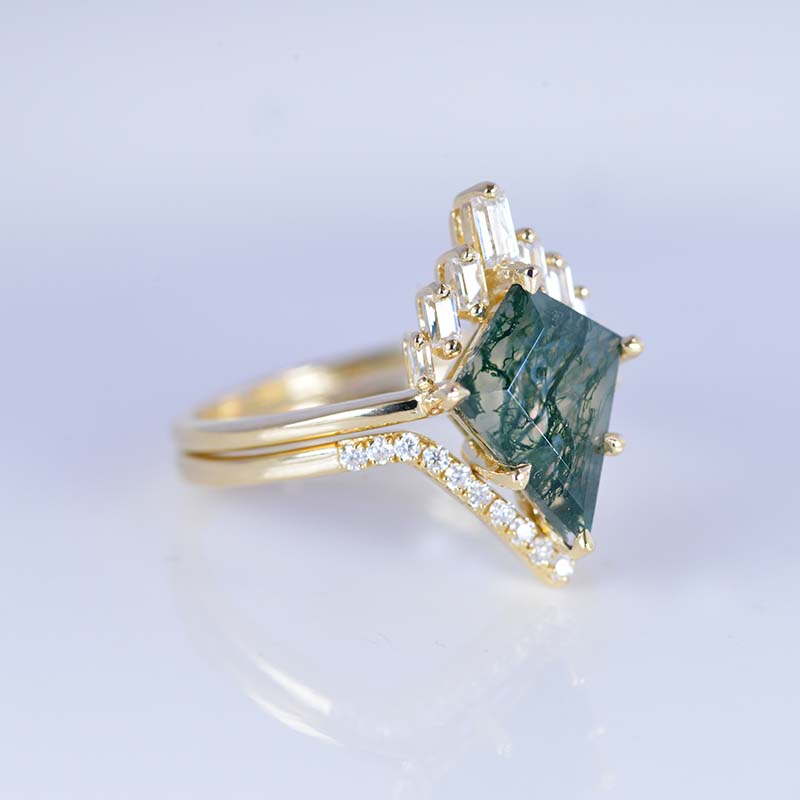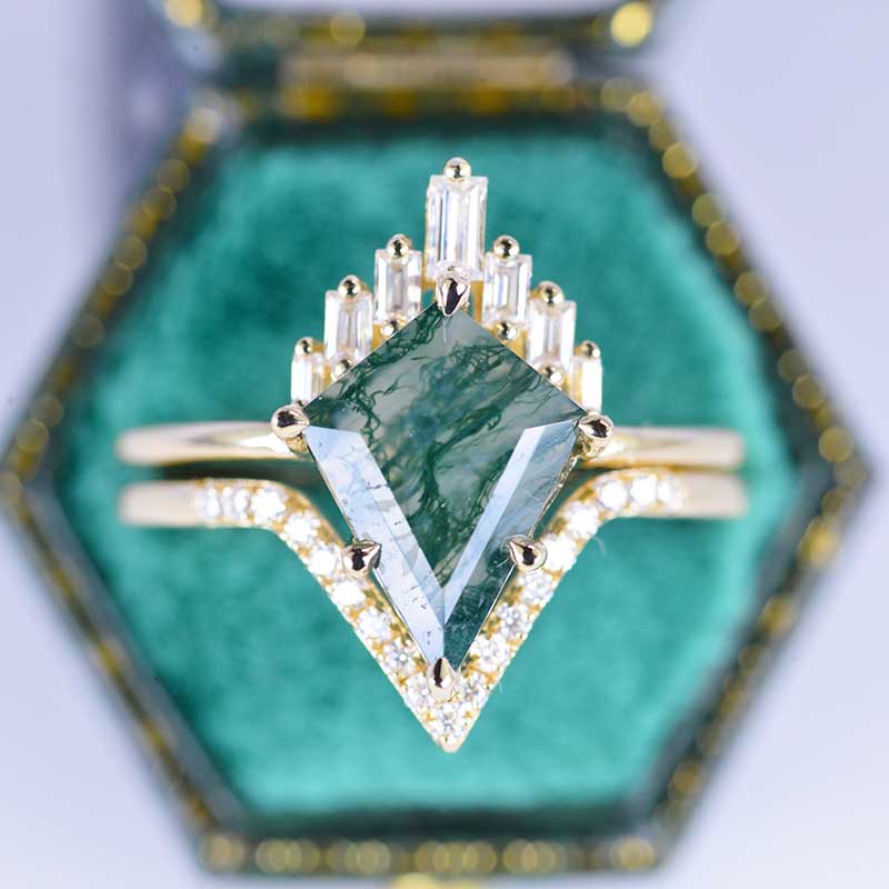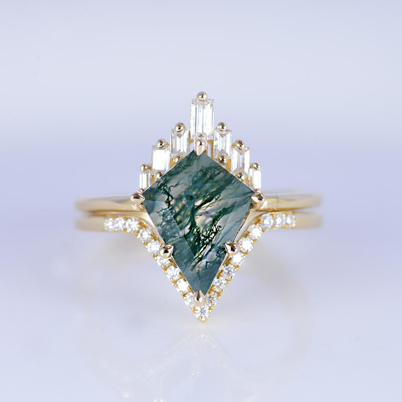 14K White Gold 5 Carat Kite Genuine Moss Agate Halo Engagement Ring, Eternity Ring Set Model 416-14x10