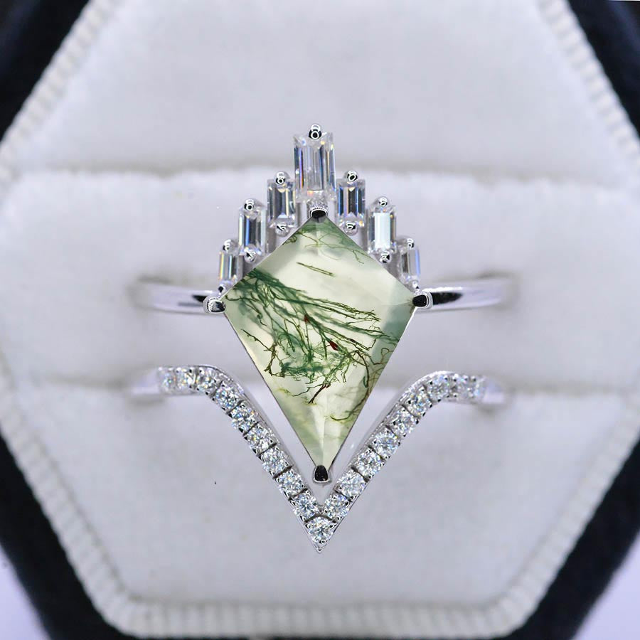 14K White Gold 4 Carat Kite Genuine Moss Agate Halo Engagement Ring, Eternity Ring Set Model 416-14x10