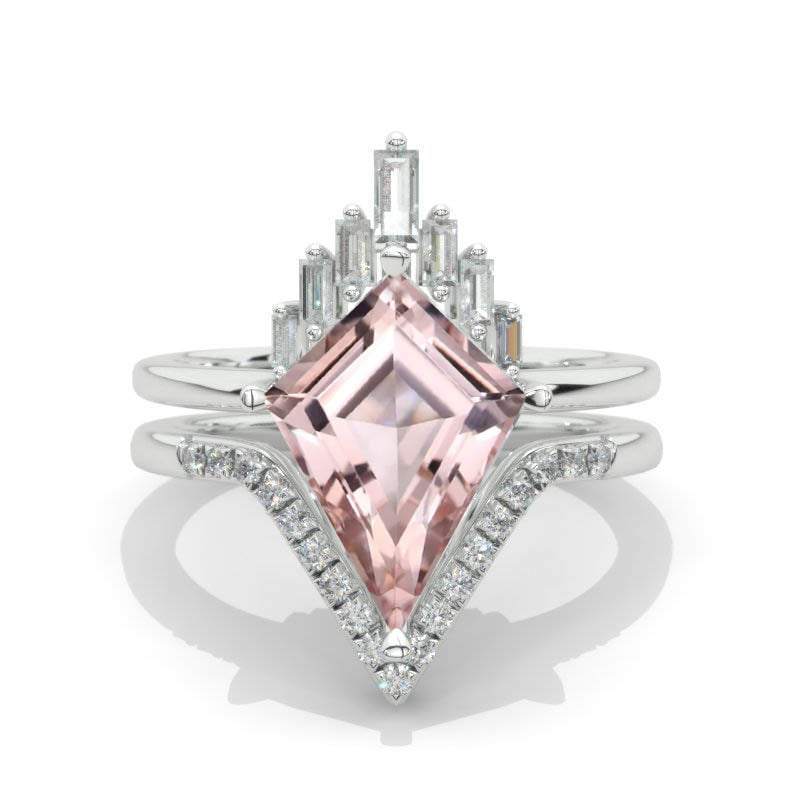 Engagement : 4 Carat Genuine Peach Morganite Kite 14x10 mm, VVS1-Clarity, VG-Cut, Ex-Polish, VG-Symmetry Center Stone with 38 Colorless 0.5 CTW Moissanite