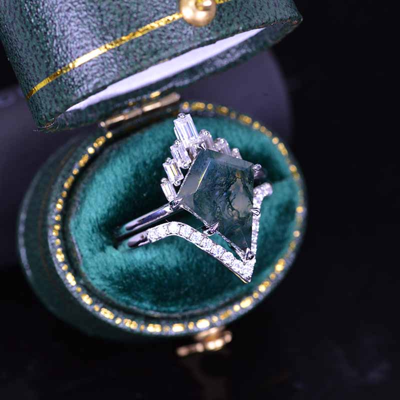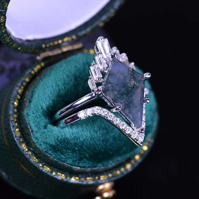 14K White Gold 5 Carat Kite Moss Agate Halo Engagement Ring, Eternity Ring Set Model 416-14x10