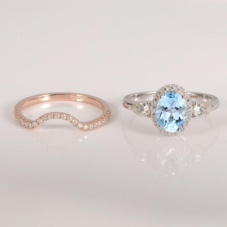 14K White Gold 3 Carat Oval Genuine Natural Aquamarine Halo Engagement Ring Eternity Ring Set