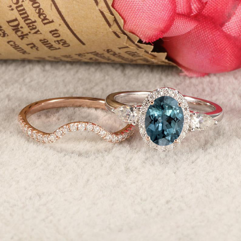 14K White Gold 3 Carat Oval Teal Sapphire Halo Engagement Ring Eternity Ring Set