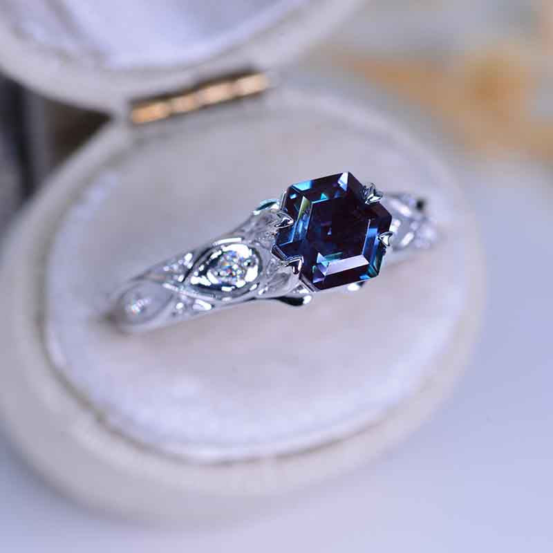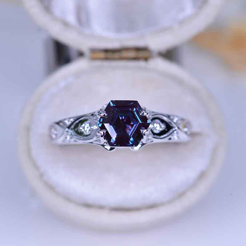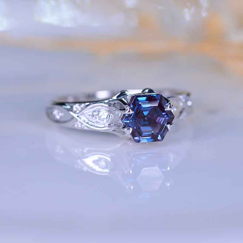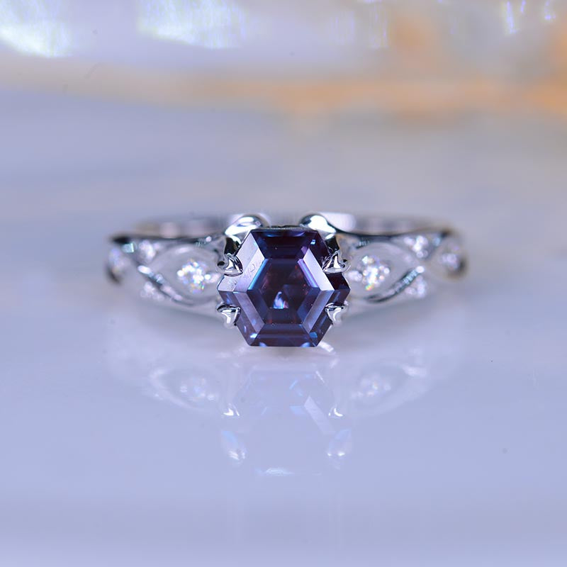 Ethically Lab-Grown Alexandrite Center Stone - Hexagon 7x6 mm, Ex-Cut, Ex-Polish, VG-Symmetry) and 8-Accents 0.1 CTW with 14K Black Gold or Black Platinum.