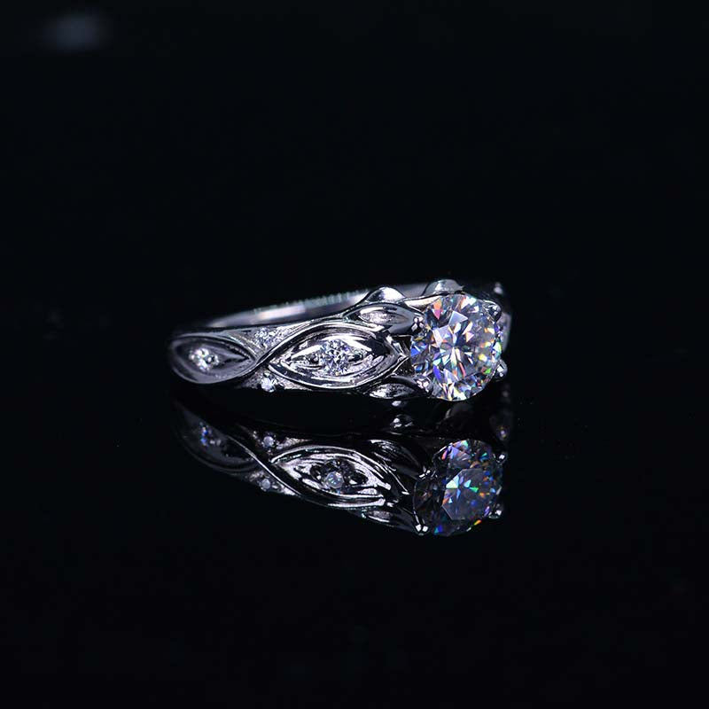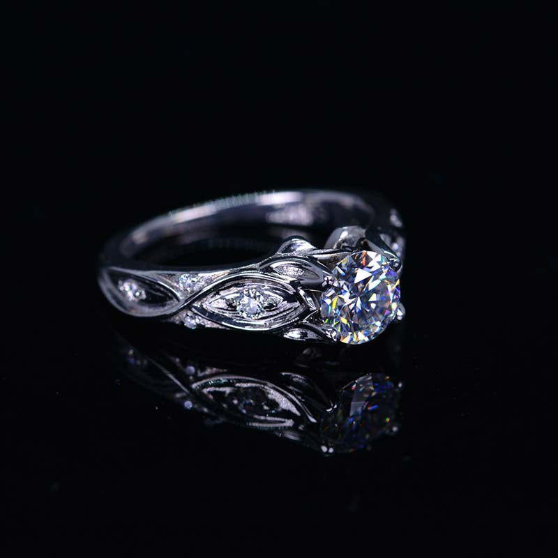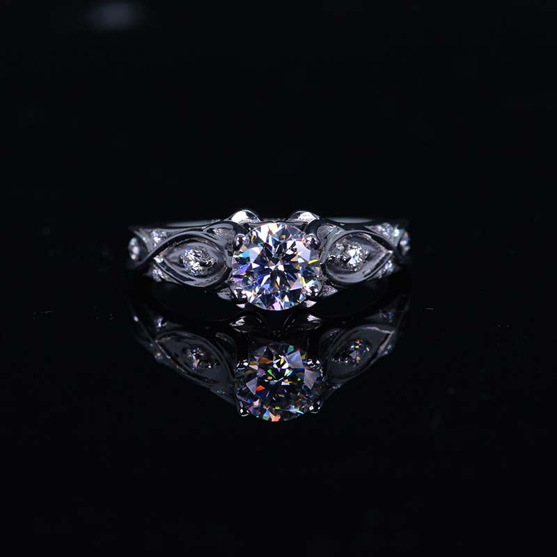 Moissanite Center Stone - Round 6mm, D-Colorless, VVS1-Clarity, Ex-Cut, Ex-Polish, VG-Symmetry and 8 D-Colorless Accents 0.1 CTW with 14K White Gold or Platinum, Silver.