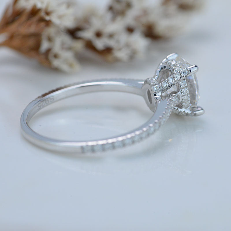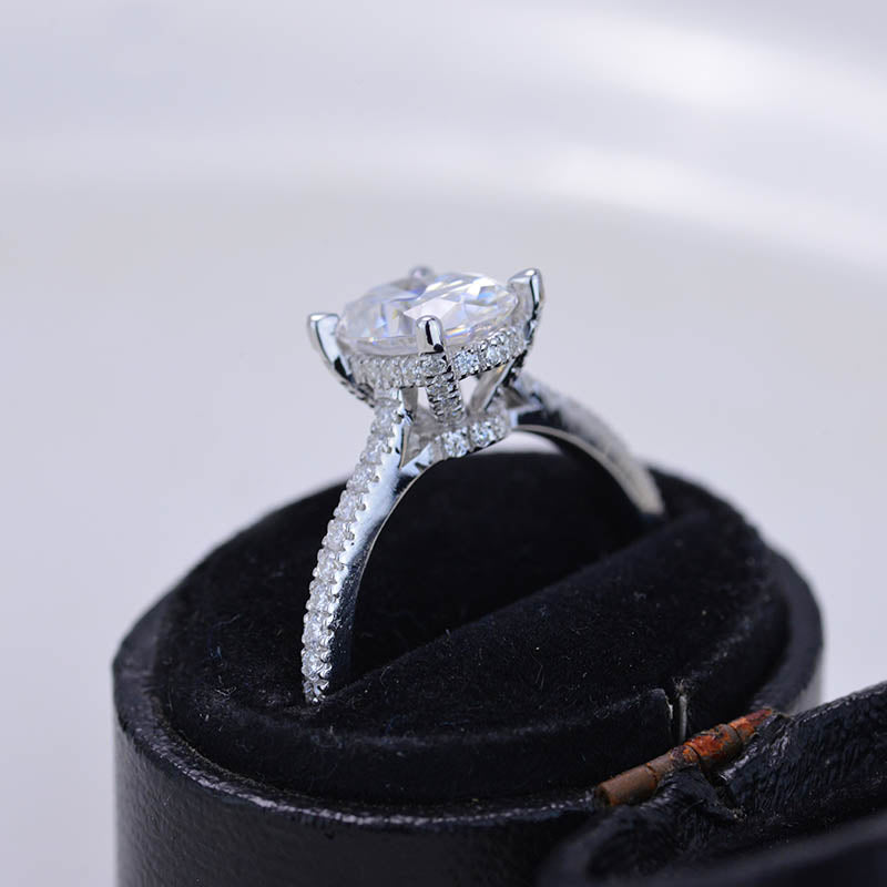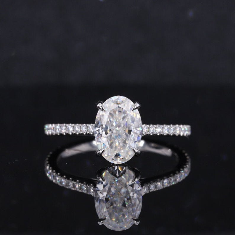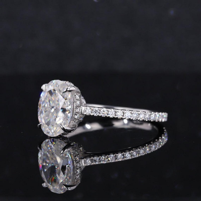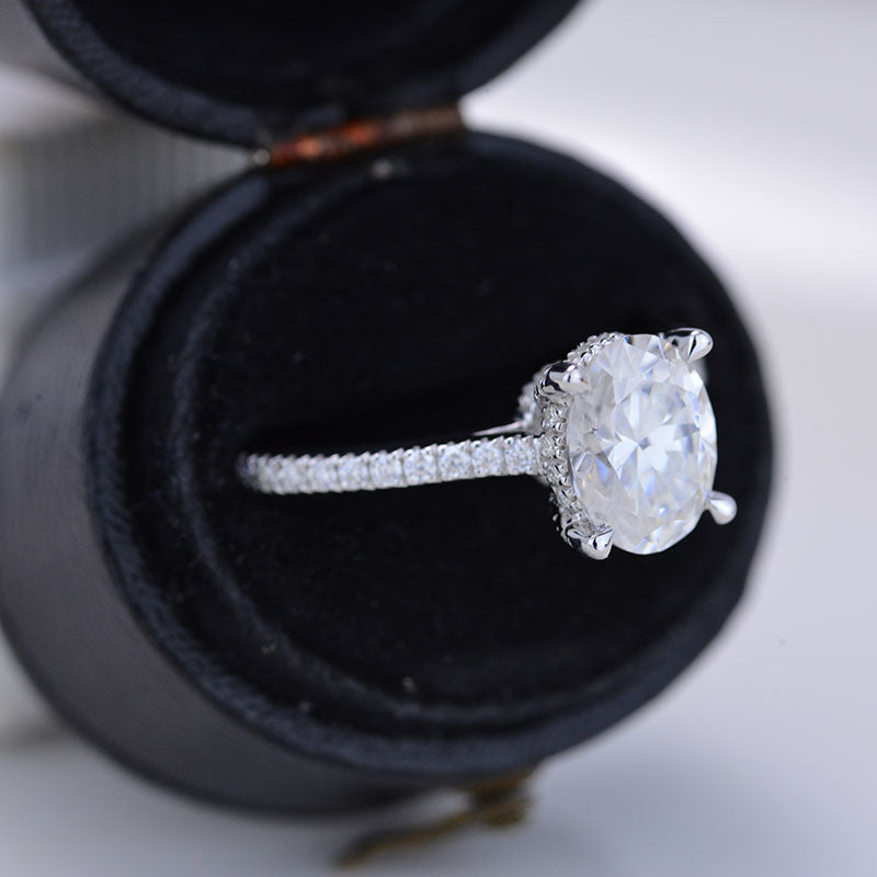 Gem Type : Moissanite Carat : 3 CT Color : D -Colorless Shape : Ice Crushed Oval Cut Clarity : VVS1 Luster : Excellent Main Stone MM : 10x8 MM Accent Stones : 0.4 CTW D-Colorless Moissanite - 96 pieces
