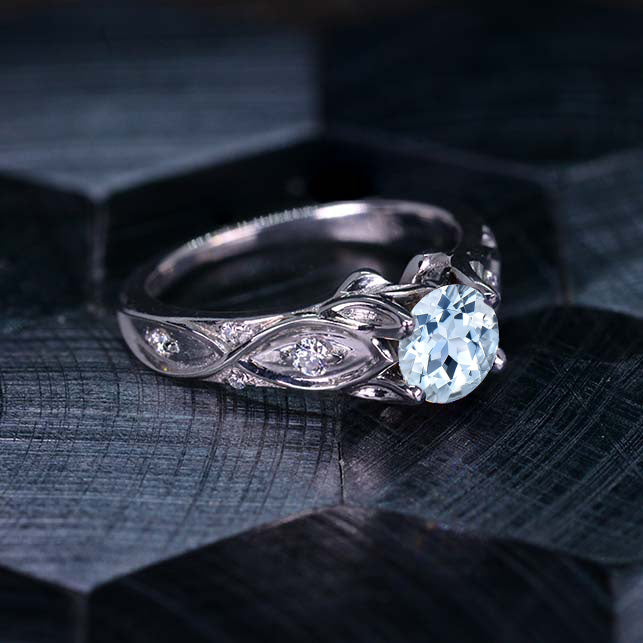 Genuine Natural Aquamarine-Grade AAA+ Center Stone - Round 6mm, Ex-Cut, Ex-Polish, VG-Symmetry and 8 D-Colorless Moissanite Accents  0.1 CTW with 14K White Gold or Platinum, Silver.