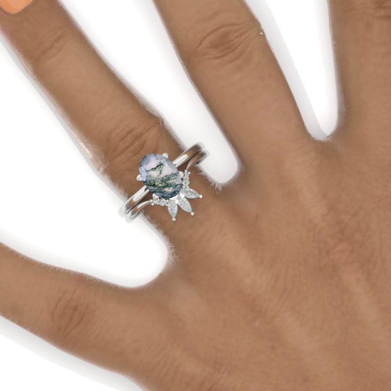 14K White Gold Oval Genuine Moss Agate Halo Engagement Ring, Eternity Ring Set Model 401