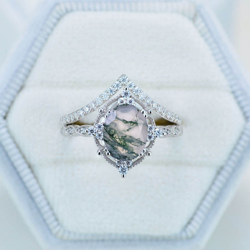 14K White Gold Ring 2CT Oval Genuine Moss Agate Halo Engagement Ring Set Model 474-9x7