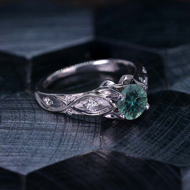 Ethically Lab-Grown Teal Sapphire Center Stone - Round 6mm, Ex-Cut, Ex-Polish, VG-Symmetry and 8 D-Colorless Accents  0.1 CTW with 14K White Gold or Platinum, Silver.