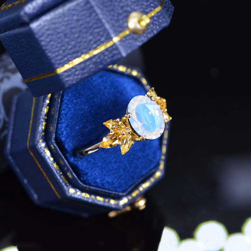 Engagement : 2 Carat Natural Moonstone Oval-9x7 mm, VG-Cut, Ex-Polish, VG-Symmetry Center Stone with  Colorless 0.6 CTW Citrine
