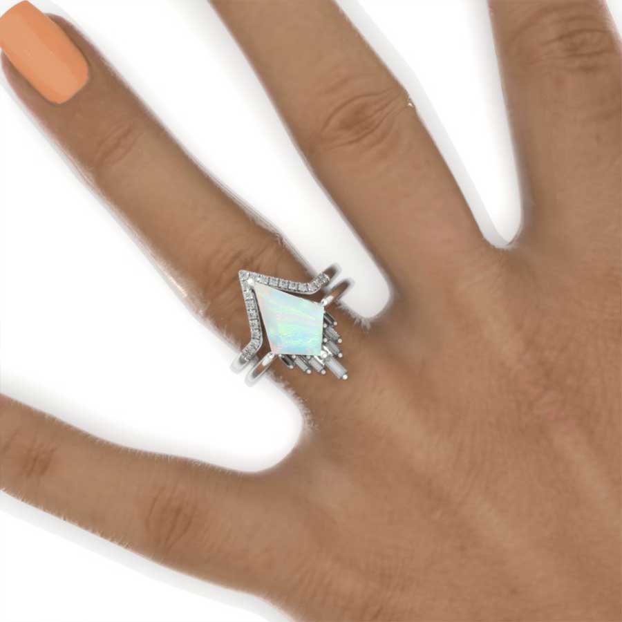 14K Yellow Gold 4 Carat Kite Genuine White Opal Halo Engagement Ring, Eternity Ring Set