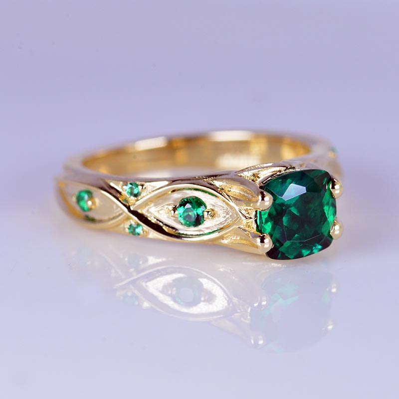 Emerald Center Stone - Cushion 6x6 mm, Ethically Lab-Grown, VVS1-Clarity, Ex-Cut, Ex-Polish, VG-Symmetry) and 8-Accents  0.1 CTW with 14K Yellow Gold.