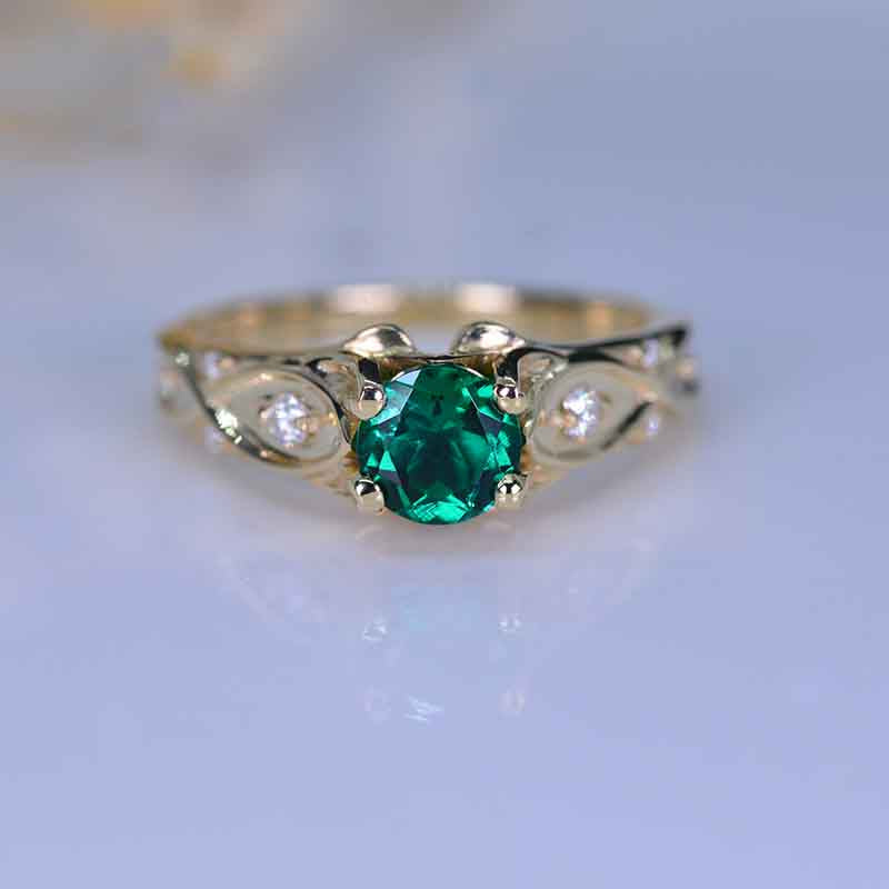 Ethically Lab-Grown Emerald Center Stone - Round 6 mm, VVS1-Clarity, Ex-Cut, Ex-Polish, VG-Symmetry) and 8 - Moissanite Accents 0.1 CTW with 14K Yellow Gold.