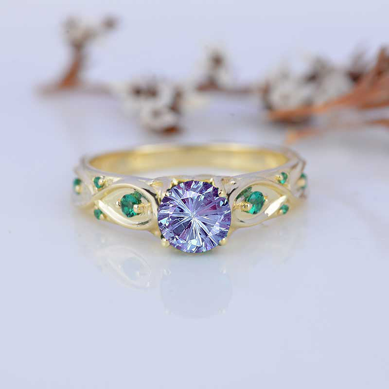 Fireworks Cut Ethically Lab-Grown Alexandrite Center Stone - Round 6 mm, Ex-Cut, Ex-Polish, VG-Symmetry) and 8 - Accents 0.1 CTW with 14K Yellow Gold.