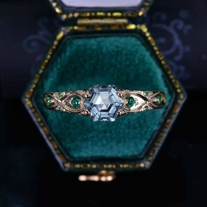 2 Carat Genuine Natural Aquamarine-Grade AAA+ Center Stone - Hexagonal 6x7 mm, Ex-Cut, Ex-Polish, VG-Symmetry) and 8 Emerald-Accents 0.1 CTW with 14K Yellow Gold.